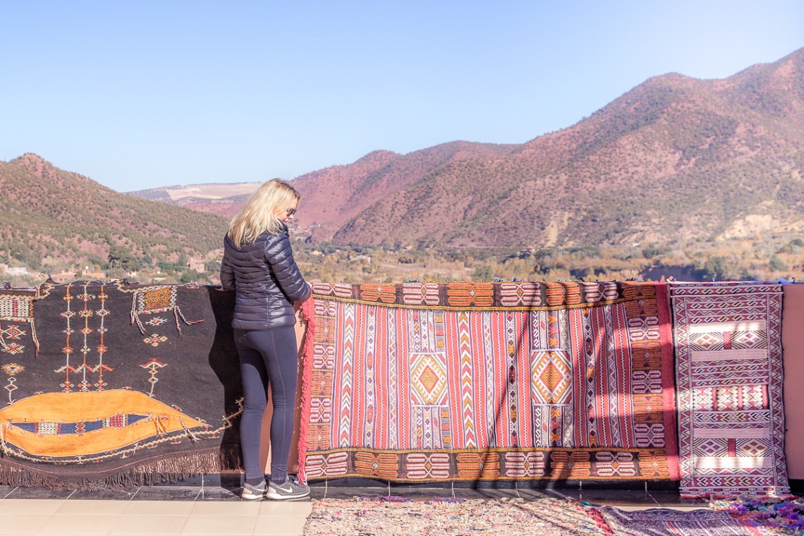 Matkaa emme kuitenkaan voineet tehdä hätiköiden, siitä piti huolen samaa virttä englanniksi jaaritteleva kuski, joka tuntui välillä keskittyvän hölöttelyyn enemmän kuin ajamiseen. Onneksi hän sentään muisti mainita, että hän pysäyttäisi auton milloin vain haluaisimme. Teimme työtä käskettyä. Muutamien kauniiden maisema- ja näköalapaikkojen lisäksi auto kaarrettiin parkkiin pienten beduiinikylien mattokauppojen eteen. Niissä pääsi näkemään mielettömän määrän eri kuosisia ja värisiä mattoja, ja niiden tihrustelun välissä saattoi liikkeiden kattotasanteilta ihailla vuoristosolan ympäristön kauniita maisemia nousevan auringon valossa. Ja kuin tilauksesta tämän tästä käteen iskettiin kuppi höyryävää minttuteetä viileässä aamusäässä. Eihän tässä olisi millään malttanut matkaa jatkaakaan näiden houkutusten äärellä!