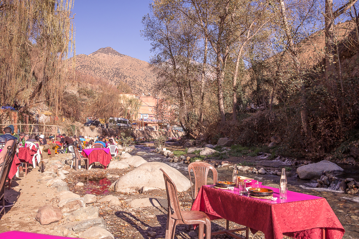 Mitä pidemmälle matkamme kulki, sitä enemmän vuoristojoen ympärillä alkoi näkymään erilaisia ravintoloita ja ties mitä matkailijoiden viihdykkeiksi viriteltyjä terasseja joen päälle. Paikat ammottivat kuitenkin tyhjyyttään. Kuski kertoi, että useat marrakechlaiset suuntaavat tänne kesäviikonloppuisin kaupungin helteitä pakoon ja silloin paikat pursuilevat ihmisiä. Ja sen pystyi hyvin uskomaan, sillä vieri vieressä sijaitsevissa ravintoloissa saattoi olla pihalle kasattuna sadoittain muovisia parhaat päivänsä nähneitä muovituoleja – millainenhan kuhina täällä kesällä oikein onkaan käynnissä? Onneksi sitä ei tarvinnut nyt todistaa. Oli liikkeellä nytkin lisäksemme muita turisteja ja paikallisia matkalaisia, mikä tosin näkyi lähinnä välillä hitaimman auton perään kasaantuneista pienistä jonoista tai tienvarsien näköalapaikoille raahatuista tylsistyneen näköisistä kameleista, joiden kanssa olisi voinut mennä kuvaan poseeraamaan vuorijonojen välkkyessä kuvan taustalla. Mielestäni oli kuitenkin kiinnostavampaa pysähdellä pienissä paikallisissa vuoristokylissä ja yrittää udella kuskilta miten täällä elelläänkään.