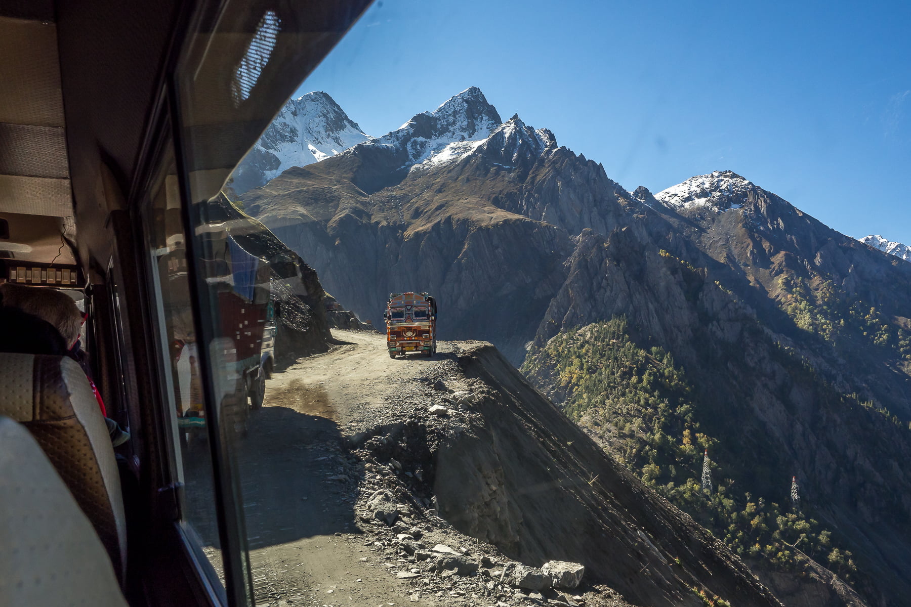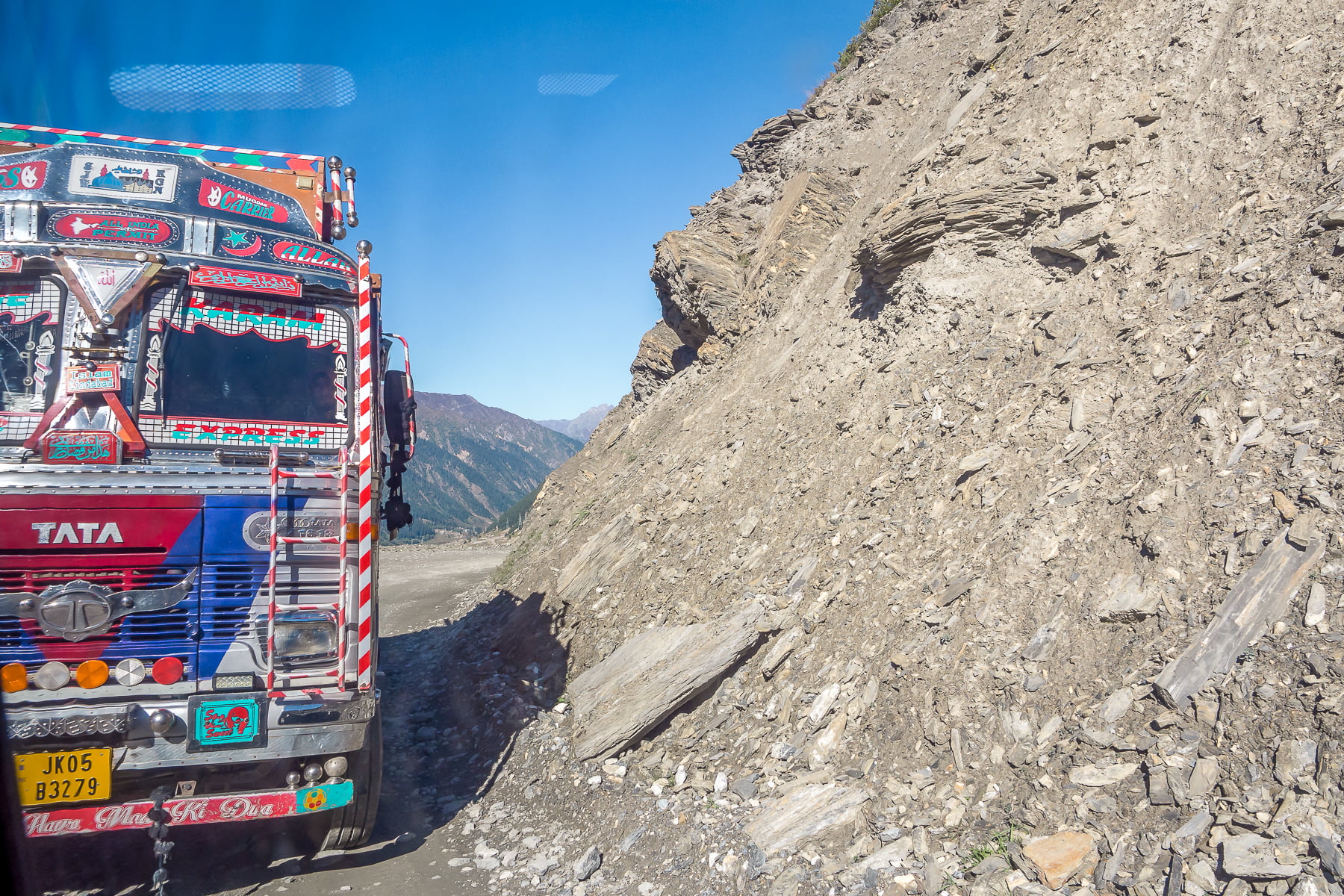 Tänään kuitenkin reitti on auki ja emme kyllä ennätä kovin kauaksi Sonmargista ajaa, kun tie alkaa nousta yhä ylöspäin. Se kiemurtelee vuorenrinnettä aina vain ylemmäksi, ja mitä korkeammalle menemme, sitä kapeammaksi tie muuttuu. Kivenmurikat rapisevat ikävästi bussin pohjaan kun se nytkähtelee eteenpäin toistuvien pysähdysten takia. Pysähdykset ovat pakollisia vastaan tulevien autojen vuoksi, sillä tie on niin kapea, ettei siinä pysty toista vauhdissa ohittamaan – pienikin harhaliike rotkon puoleiselta kuskilta, ja auto tippuisi tieltä. Täällä ei nimittäin tunneta turva-aitoja, ja kaiken kukkuraksi tienreunama näyttää niin heikolta, että epäilen sen murenevan taivaan tuuliin painavampien autojen alla. Mutta mitä vielä, vastaan puskee useampia värikkäitä kuorma-autoja, joiden kuskit tottuneesti ohjailevat lähes yhdellä kädellä menopelejään vain muutamien senttien päässä tien reunamasta. En halua edes ajatella kuinka monien satojen metrien pudotus jyrkänteeltä onkaan alas.