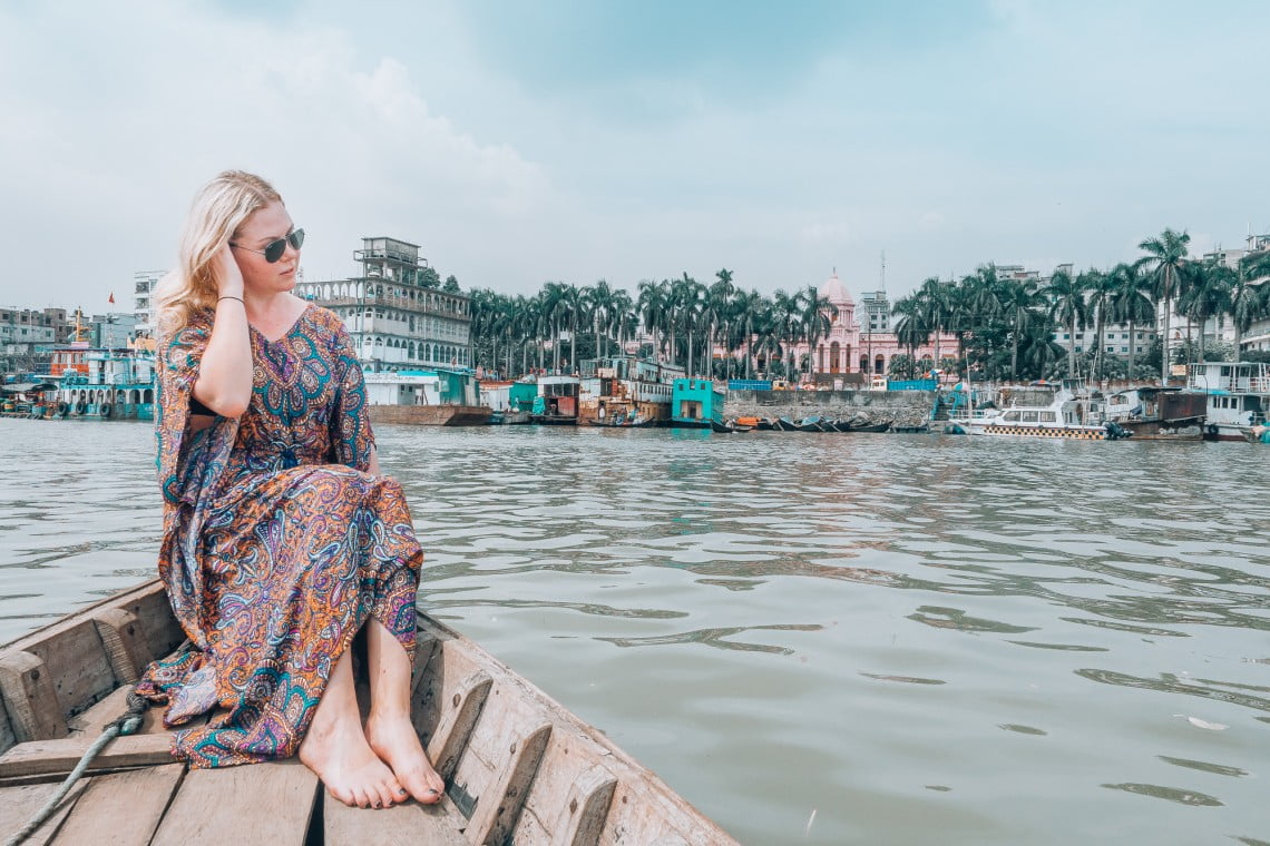 Kun kaarramme lähemmäksi joen rantaviivaa, näen vehreiden palmupuiden rivistön takaa siintävän vaaleanpunaisen palatsin ylvään kupolin. Ahsan Mansil. Näkymä on epätodellinen, aivan kuin jostakin eksoottisesta entisajan sadusta. Kun palatsin takaa alkaa taivaalle vielä kohoamaan tummanpuhuvia ukkospilviä, huomaan kylmienväreiden kulkevan hikisen kroppani lävitse. Miten ennaltaodottamattomina hetkinä, keskeltä rujoutta ja rumuutta voikaan yhtäkkiä löytää palan kauneutta, kun vain muistaa avoimin mielin katsoa ympärilleen missä tahansa reissaakaan.