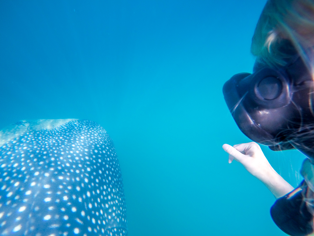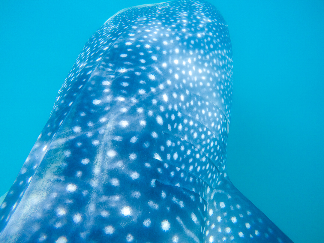Seuraavilla uintikerroilla kokemus oli vieläkin upeampi kuin ensimmäisellä. Yhdessä vaiheessa noin 5 metrinen valashai ui minua vastaan aivan pinnassa, ja pystyin selvästi erottamaan sen suupielissä puhdistustöissä vilahtelevat pikkukalat kun valas aukaisi suunsa. Vain noin metrin päästä se vaihtoi tyynesti suuntaa, ja olin salaa onnellinen ettei se tullut aivan iholle kiinni. Vaikka nämä jättiläiset ovatkin planktoninsyöjiä, on niiden koko sen verran vakuuttava, etten halunnut jäädä katselemaan kuinka helposti sen suuhun voisi humpsahtaa. Pari kertaa pääsin uimaan valashaiden yläpuolella useiden minuuttien ajan, ja nuo hetket olivat varmasti niitä parhaita – muut turistit olivat jääneet räpiköimään taakse ja pääsin yksin nauttimaan tästä upeasta hetkestä kaikessa rauhassa. Valaat eivät enää tuntuneetkaan pelottavilta, vaan päinvastoin, niiden kanssa vedessä uidessa mielen valtasi jollakin erikoisella tavalla tyyni rauhallisuus.