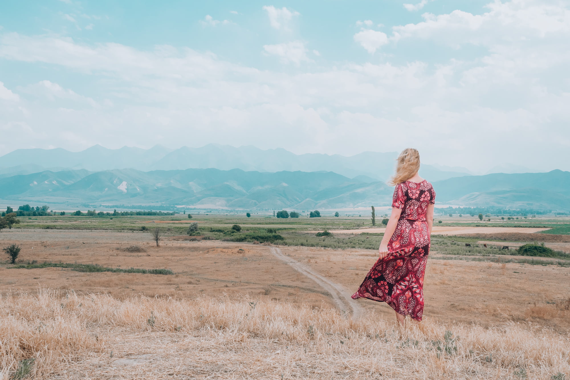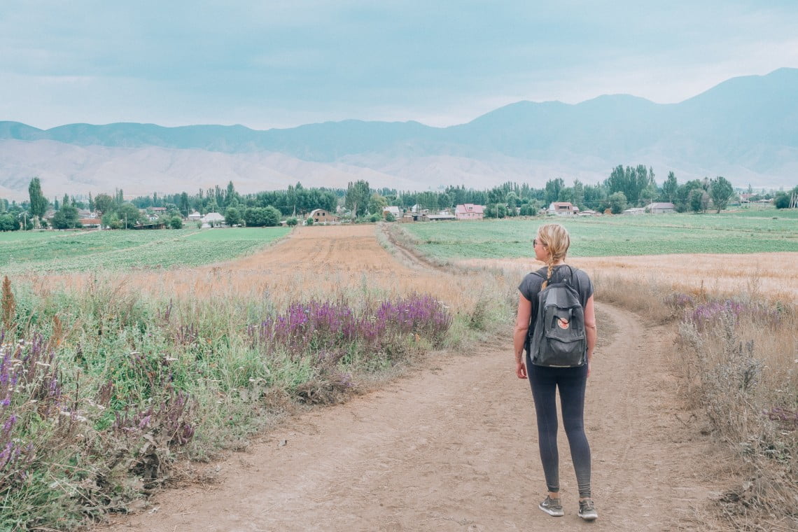 Lähdin kävelemään samaan suuntaan pölyistä peltotietä pitkin. Ilman kiirettä minnekään ihastelin ympärillä avautuvia seesteisiä maisemia ja kuuntelin pienen jokiuoman rauhoittavan solisevaa ääntä. Kuvitella, täällä olin keskellä Kirgisian maaseutua, paikassa, josta en ollut tiennyt etukäteen mitään, hädin tuskin sen olemassa oloa. Mutta olin sangen tyytyväinen että olin just nyt just täällä.