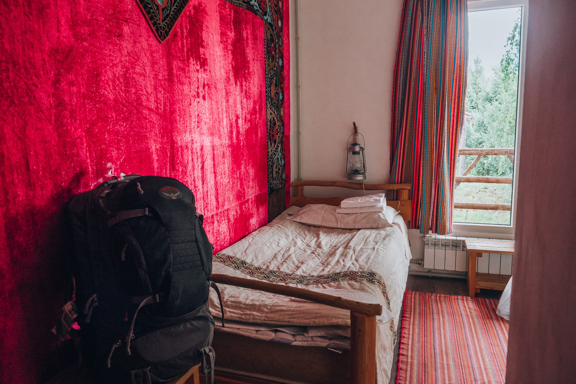 Olisin voinut jatkaa tätä matkaa vielä vähän pidempäänkin omissa oloissani. Nyt kuitenkin jouduin nappaamaan rinkan selkääni, mutta onneksi harmitus oli vain hetkellistä, sillä kun näin suloisen pienen pinkin huoneeni, olin myyty majapaikalle. Kaiken kukkuraksi ympärillä olevan maalaismaisemat tuntuivat jotenkin rauhoittavilta, sellaisilta, että täällä olisi hyvä olla paossa kaikkea (tai ainakin omaa elämää). Ilta-auringon laskiessa peltojen takana siintävien vuoriryppäiden taakse, jatkoimme vielä muiden matkalaisten kanssa iltaa majapaikan kuistilla paikallista olutta siemaillen ja illallista kieli pitkällä odottaen.