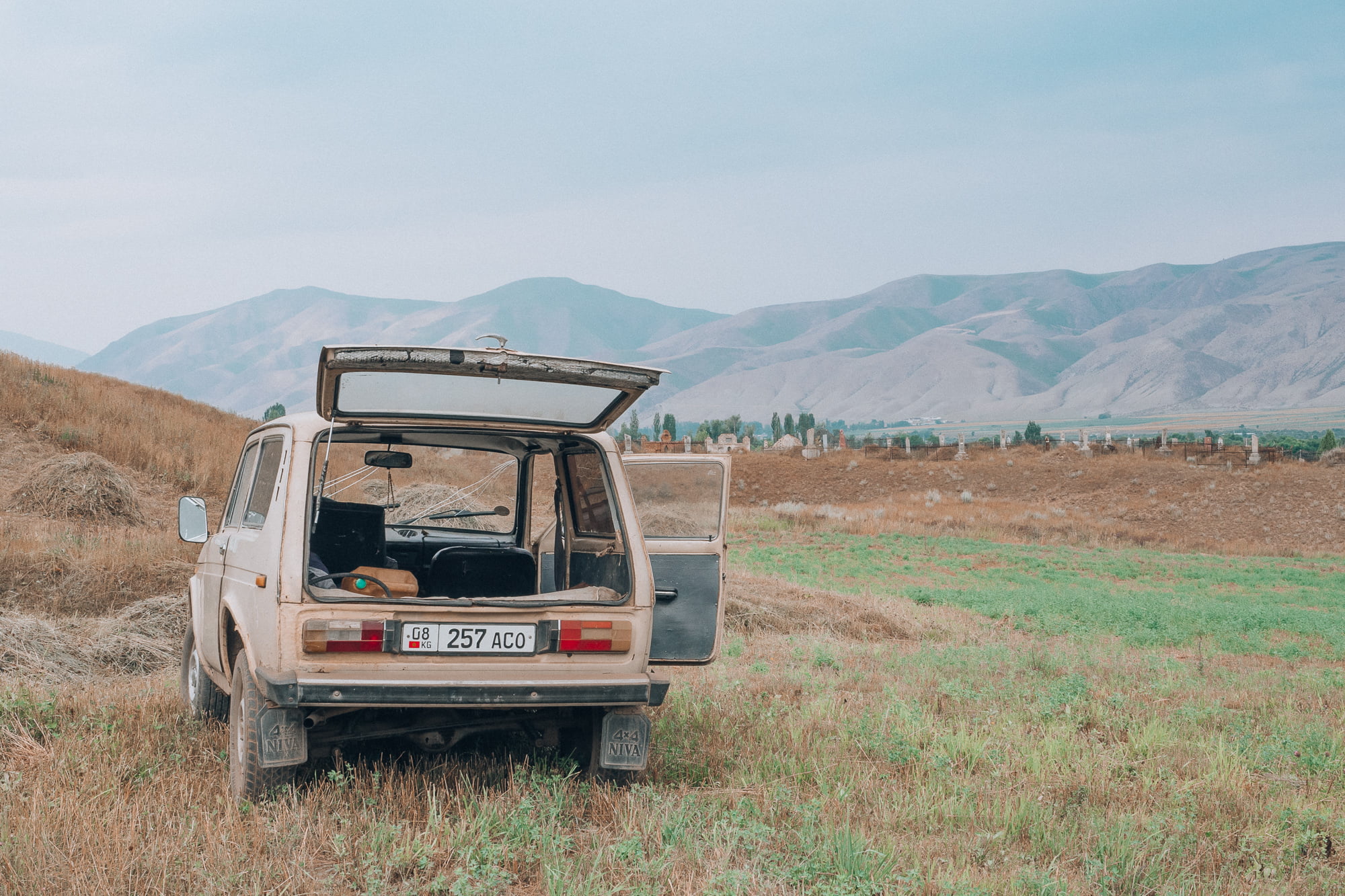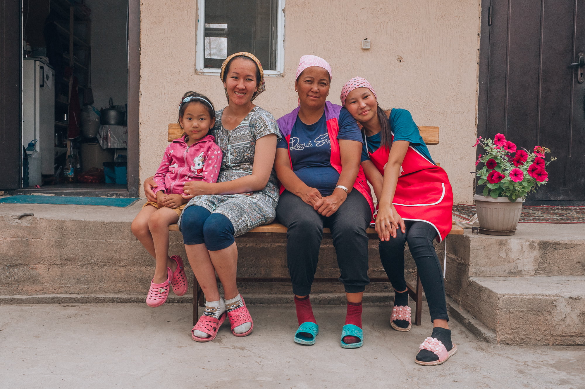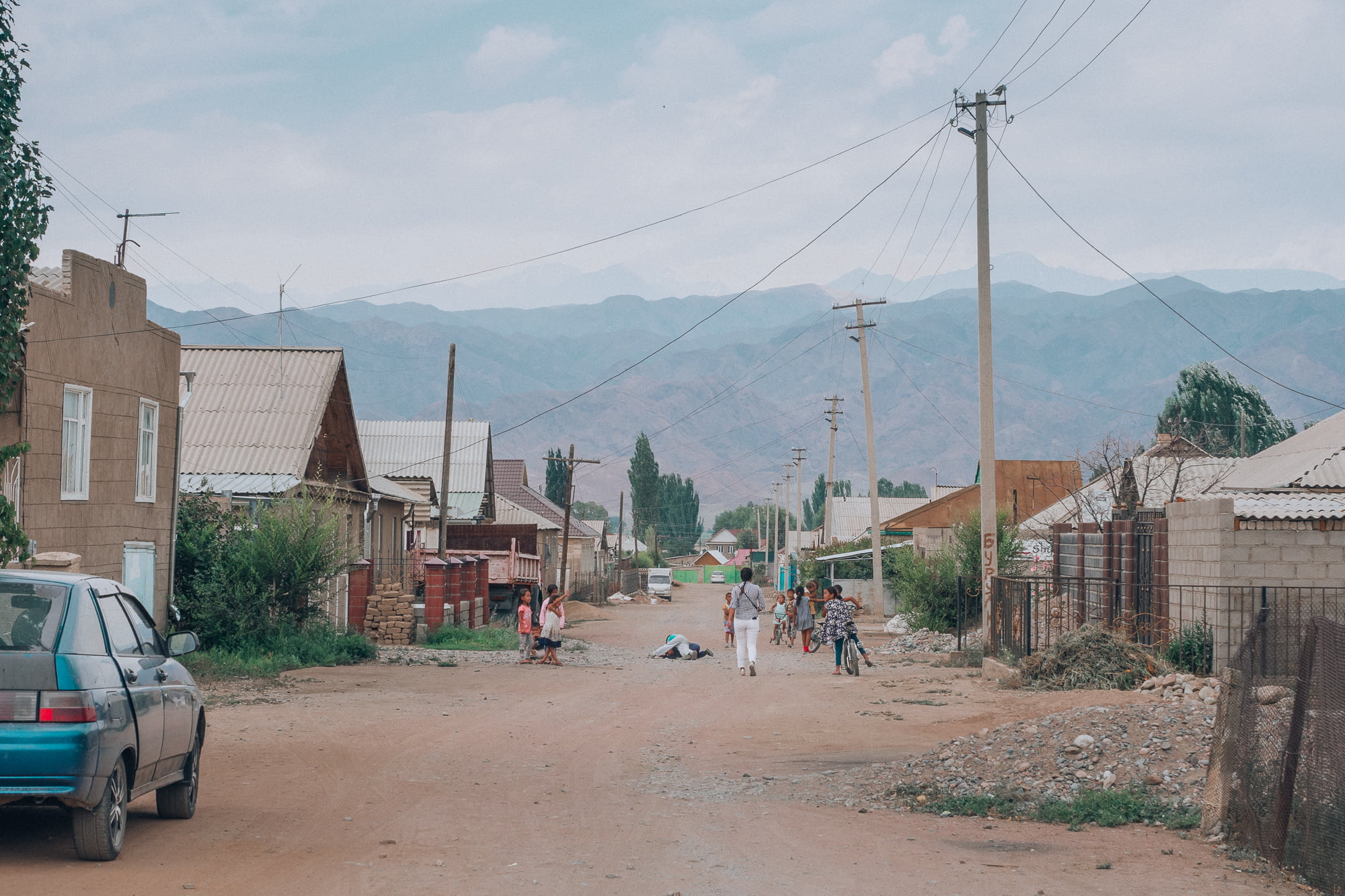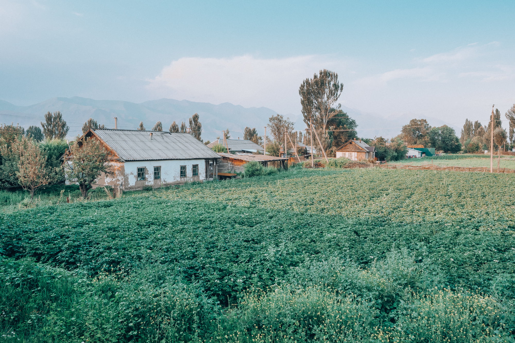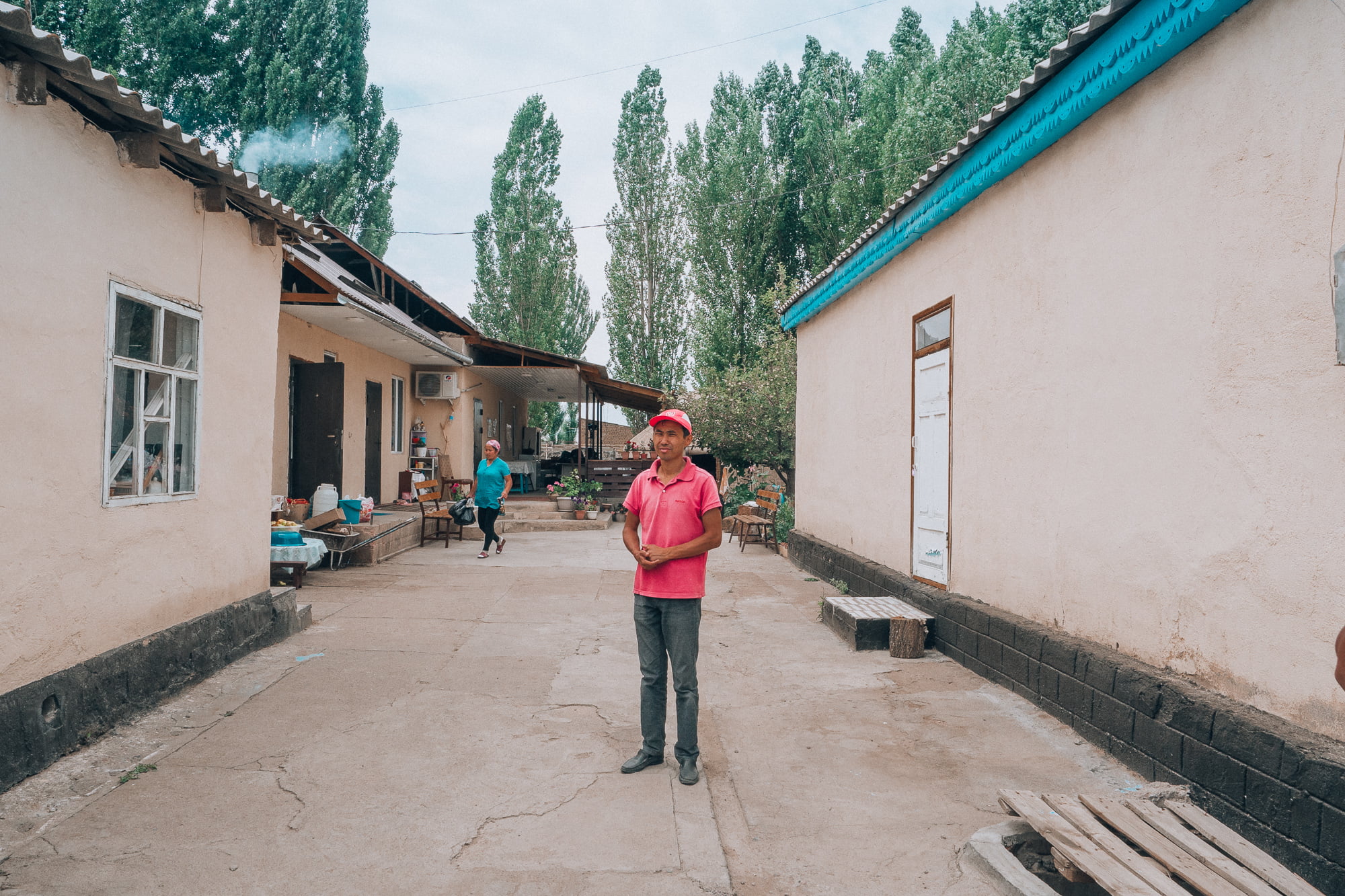 Hiljalleen Bishkekin leveät kaupunkikadut muuttuivat yhä pienemmiksi maalaisteiksi ja ikkunan takaa näkyi joka suuntaan avaraa peltomaisemaa. Puolihorroksessa torkuin lähes koko matkan, ja salaa olin vähän ärtynyt, kun lopulta illansuussa minibussi kaartoi maaseutukylän laidalla sijaitsevan majapaikan sisäpihalle.