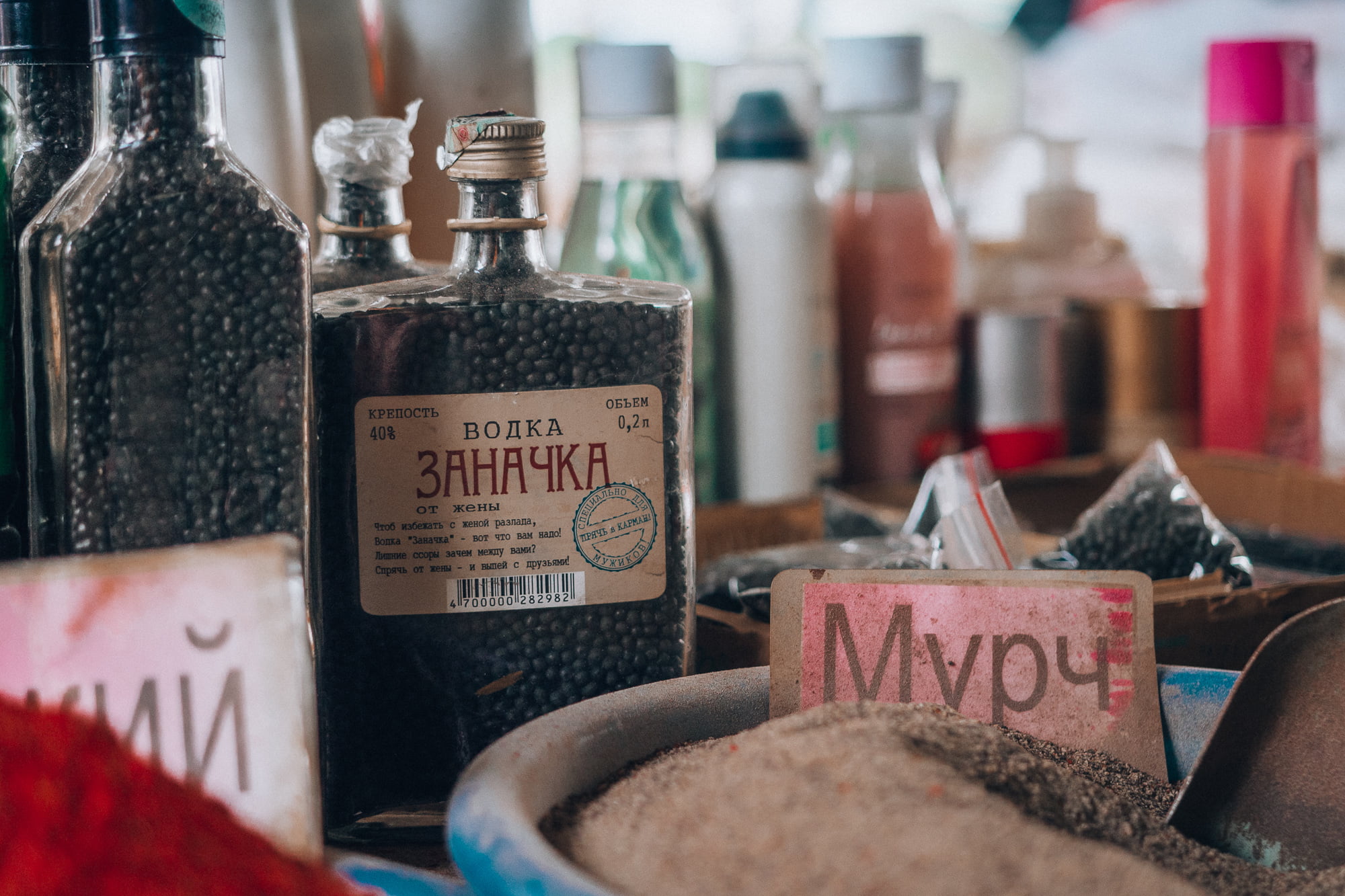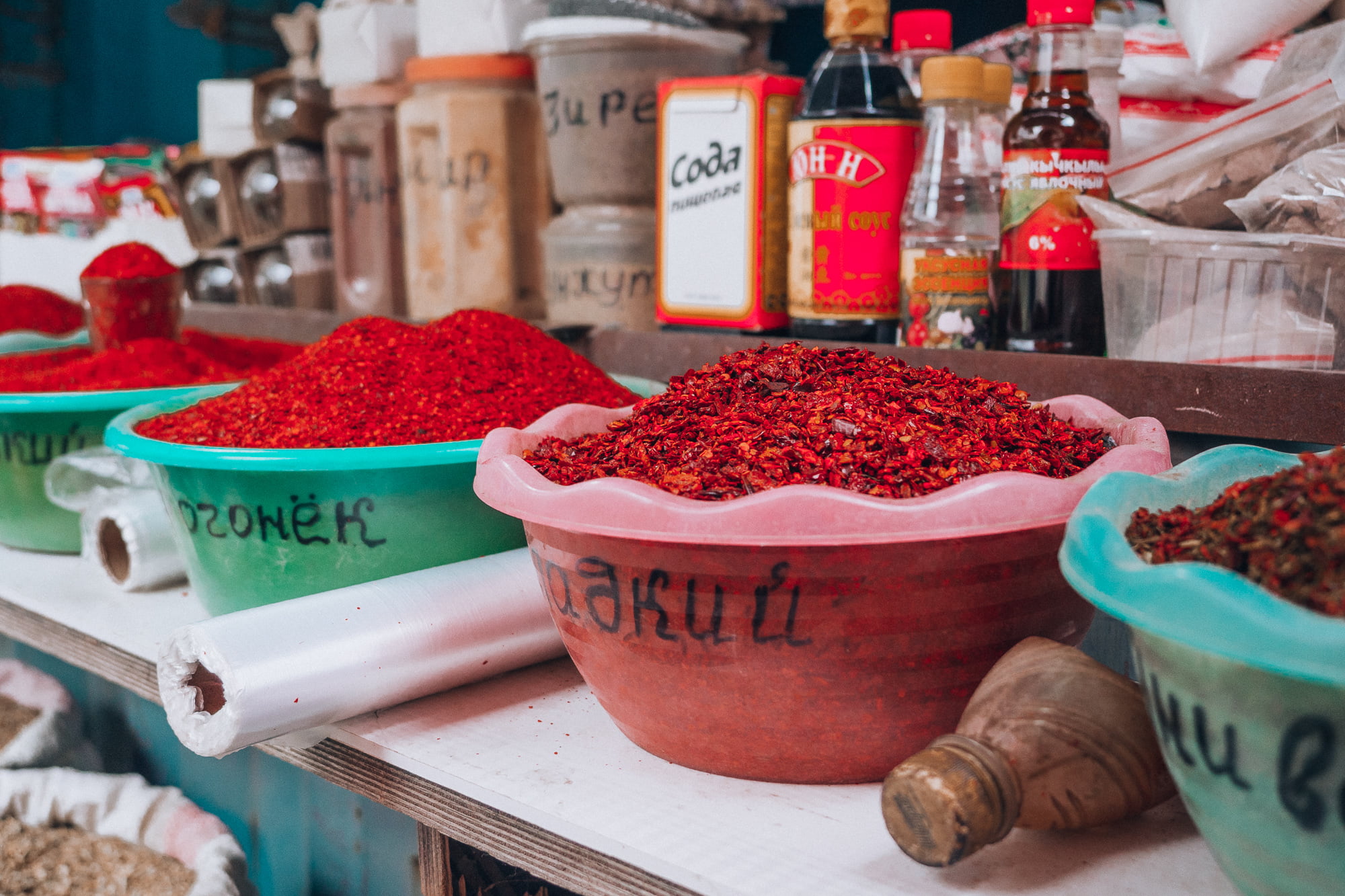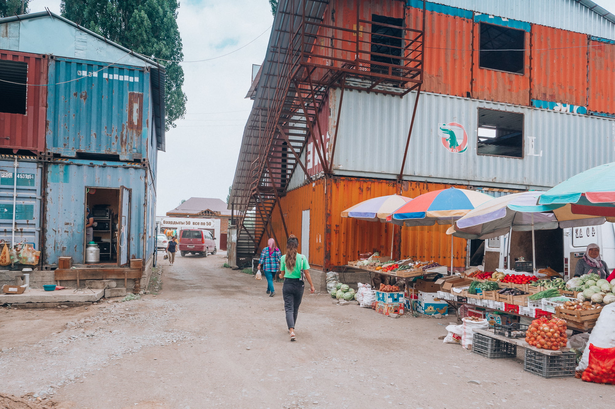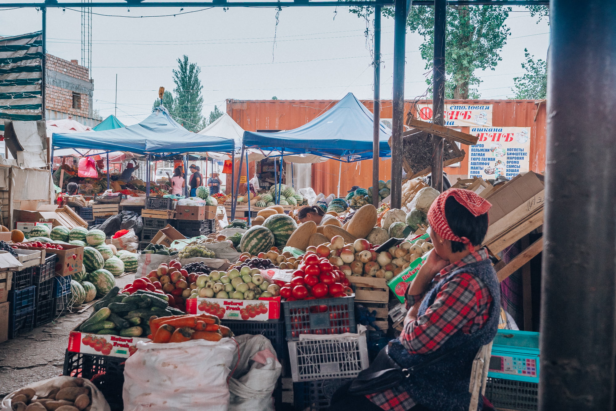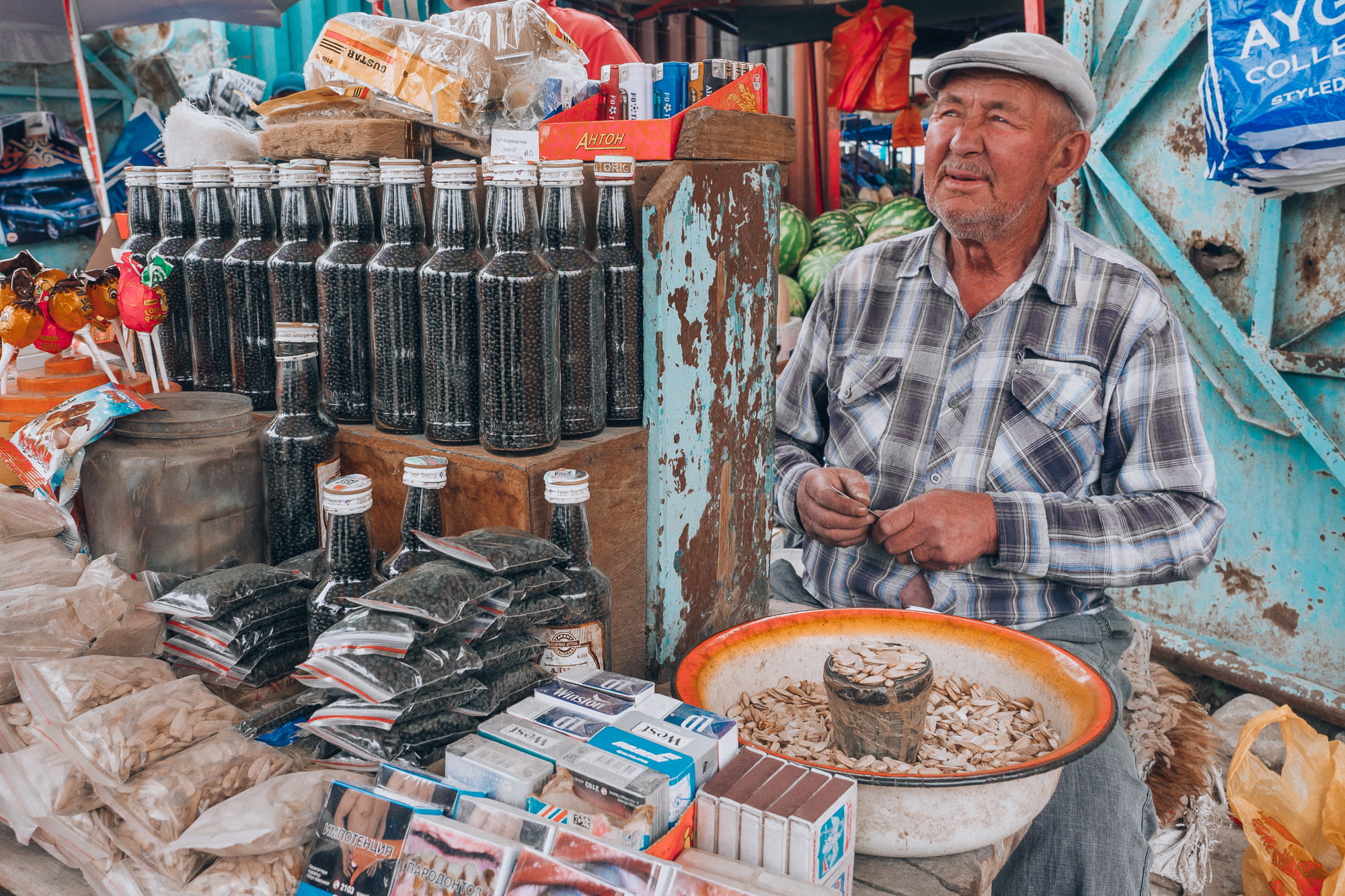 Aamupäivällä pakkasimme minibussin uudelleen ja suuntasimme lähikylän markkinakojujen kautta eteenpäin yhä syvemmälle Kirgisian erämaita. Markkinoilta oli tarkoitus ostaa eväitä seuraavia päiviä varten, mutta oma aikani meni ostosten sijaan enemmän ihmetellen piskuisen markkina-alueen notkuvia vihannespöytiä ja erikoisia myyntituotteita. Vanhoissa viinapulloissa näytti olevan myynnissä mustapippuria, mutta voi kuinka väärässä olinkaan – vanha myyjäukko rouhaisi pullosta mustia helmen mallisia pyörylöitä käteensä ja kiinnitti ne ylähuulensa alle. Tupakkaa kuulema.