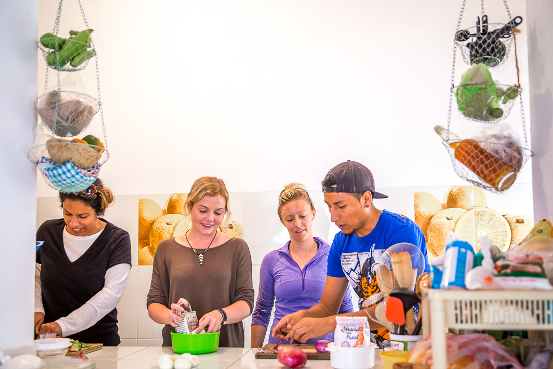 Perusateria Boliviassa koostuu usein riisistä, perunoista tai quinoasta esimerkiksi kanan ja papujen kera. Yksi ehdoton kokeilemisen arvoinen paikallisherkku ja helppo eväs on jokaisessa katukojussakin myytävät pasteijamaiset Saltenas, joiden sisällä on erilaisia täytteitä kuten kasvis- tai kanatäyte. Kokkauskurssilla pääsin valmistamaan Papas Rellenas ”täytettyjä perunoita”, jotka maistuivat mielettömän hyviltä itsetehdyn chilikastikkeen kanssa! Suosittelenkin ehdottomasti osallistumaan kokkauskurssille ja sitä kautta maistelemaan aitoja Bolivian makuja. Suuremmista kaupungeista löytyy myös erilaisia ravintoloita ja erityisesti kahvilakulttuuri kukoistaa. Eikä korkeassa ilmanalassa kannata unohtaa paikallista superfoodia, eli kokapensaan lehdistä valmistettua vihreää teetä, joka auttaa mm. hengitysvaikeuksiin.