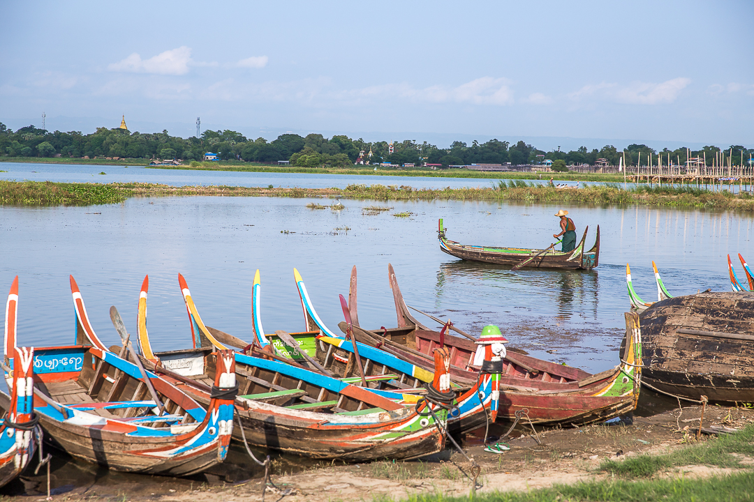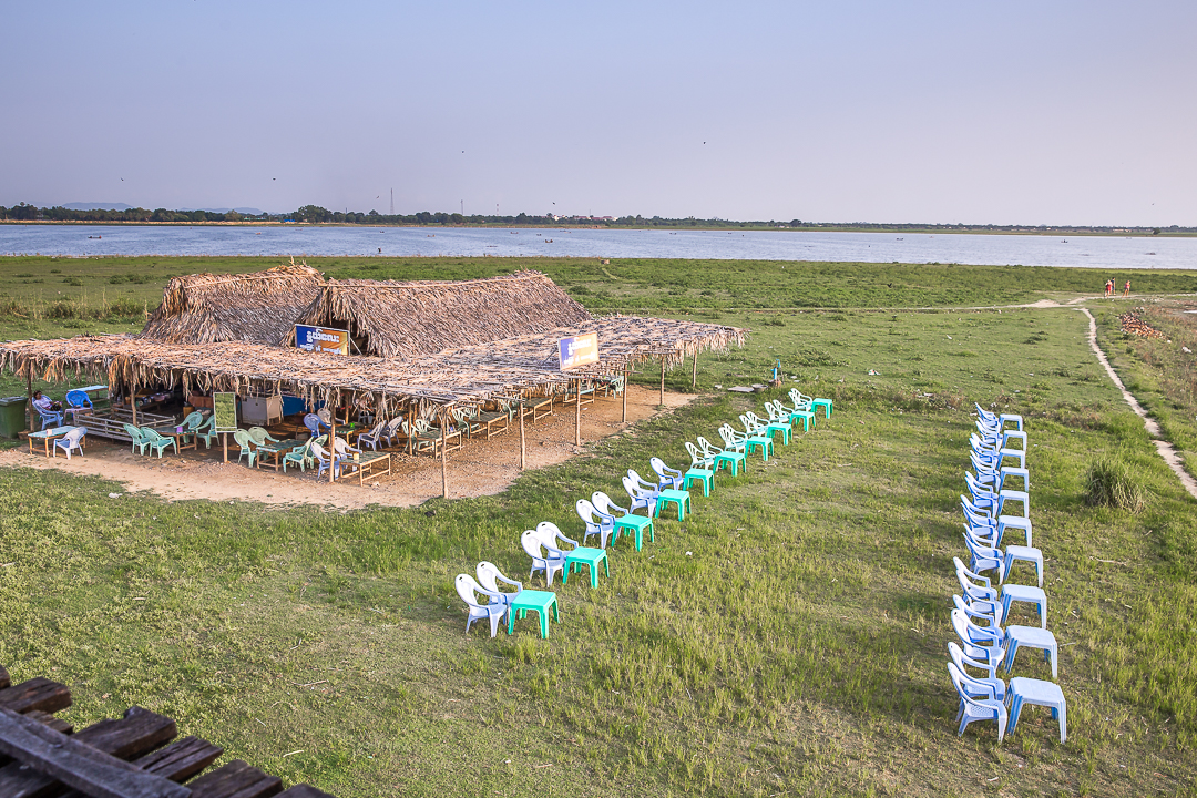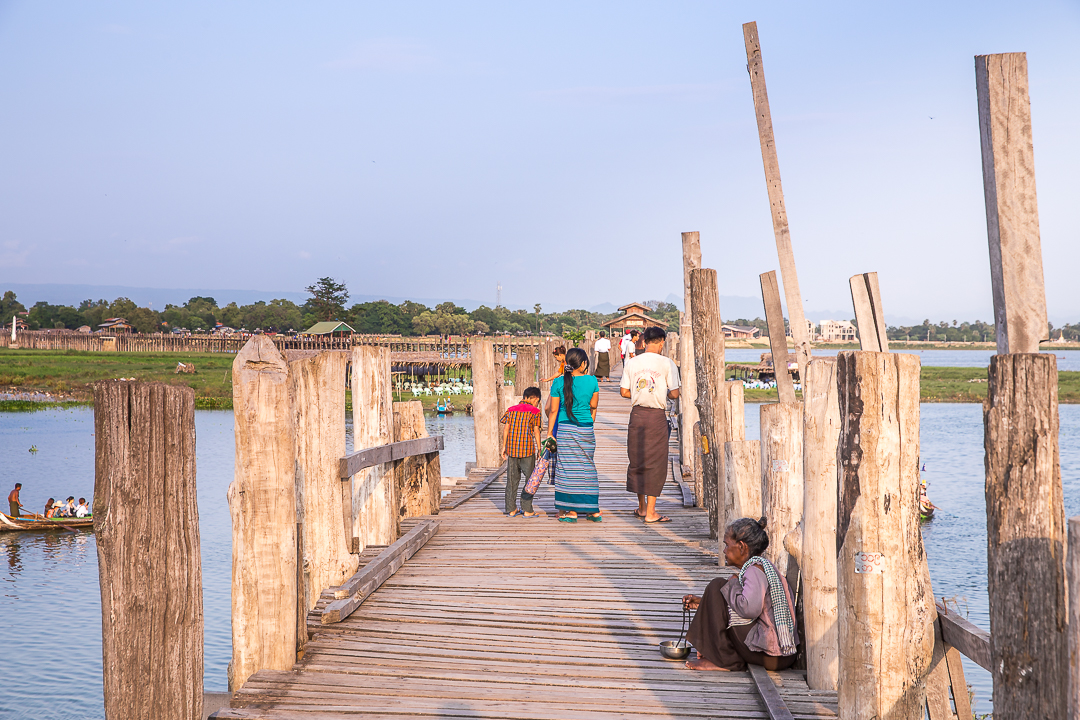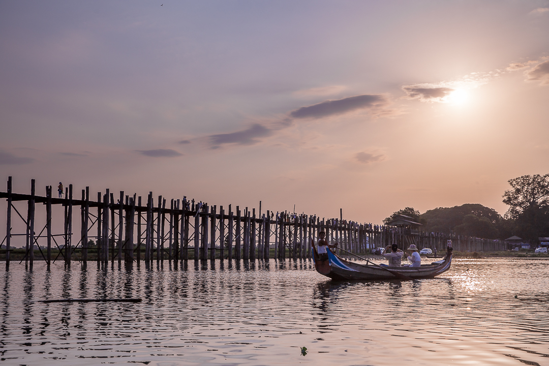 Mandalayssa ollessa yksi nähtävyys on ylitse muiden: tiikkinen U Bein -silta. Se on sekä Mandalayn että koko Myanmarin kuvatuin nähtävyys, joten pitihän se omin silmin päästä näkemään. Nappasimmekin matkaystäväni kanssa hotellilta meille kuskin ja hurautimme autolla Taungthaman-järven rannalle hyvissä ajoin ennen auringonlaskua. Rannalla retkiä sillan ympäristöön tarjoavat venekuskit virittelivät jo paattejaan vesille, järveltä nimittäin näkisi auringonlaskun parhaiten, mikäli oli etukäteen näkemiäni valokuvia oli uskominen. Vielä ei kuitenkaan ollut auringonlaskun aika, niinpä istahdimme rantaravintolaan odottelemaan hieman myöhäisempää hetkeä suunnata ensin sillalle kävelemään ja sen jälkeen vielä soutuveneen kyytiin siltaa eri perspektiivistä ihastelemaan.