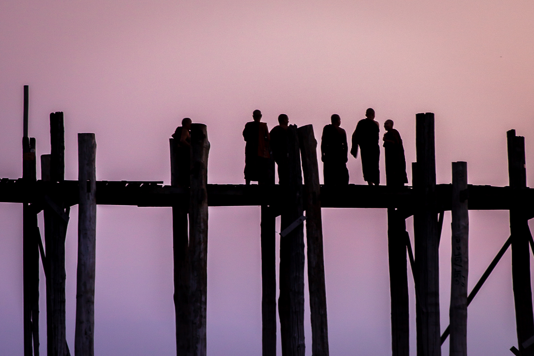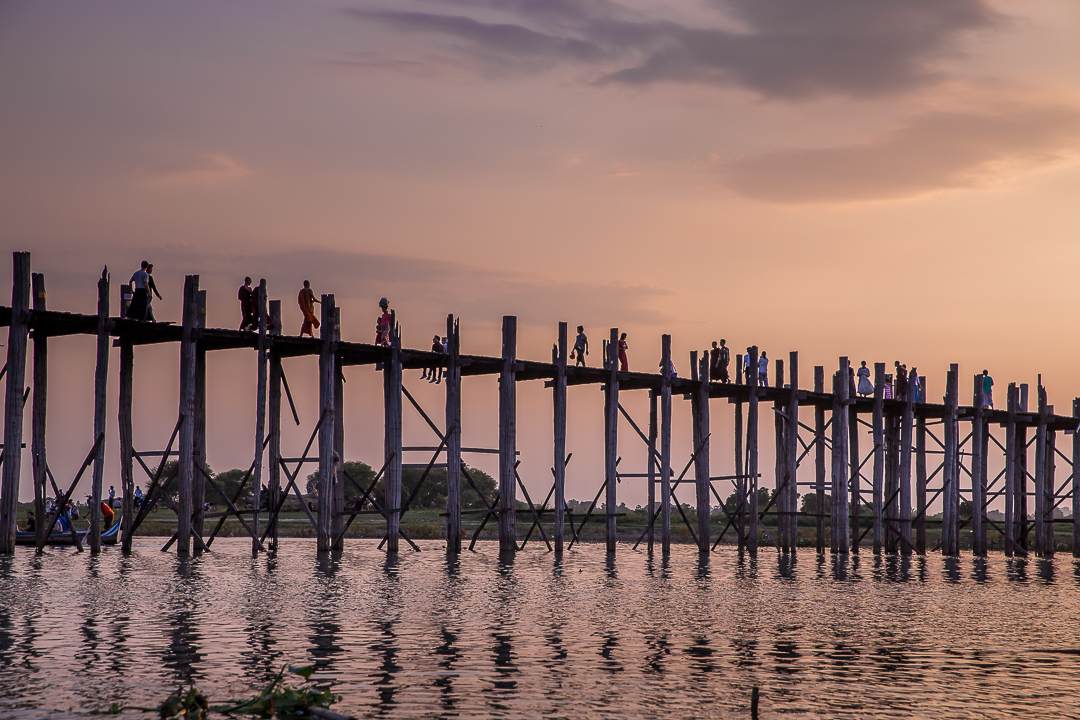 Kun aurinko alkoi maalaamaan maisemaa yhä lämpimämmillä sävyillään, lähdimme hipsimään kohti siltaa. U Bein -silta on rakennettu Taungthaman-järven ylle hieman alkeellisen näköisistä tiikkiparruista, mutta se onkin se juttu, miksi silta on niin kuuluisa. Se on maailman pisin tiikkisilta kulkien korkealla veden päällä reilun kilometrin matkan. Silta on edelleen kovassa käytössä varsinkin iltaisin, kun paikalliset porskuttavat siltaa pitkin kahden kaupunginosan välillä. Hieman huteralta silta kyllä jo alkaa vaikuttaa, sillä askelten alla osa lankuista vähän notkuu pahaenteisesti ja tiikkisiä tukipilareita on paikkailtu bambukepein. Huomaan, että loppupäästä siltaa tiikkiparruja on jo jouduttu korvaamaan betonisilla rakenteilla. Taitaa siis olla vain ajankysymys kuinka kauan tämä erikoinen nähtävyys on enää olemassa.