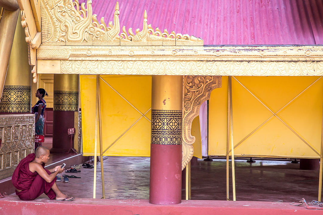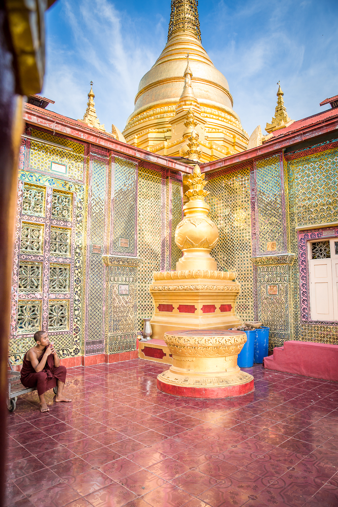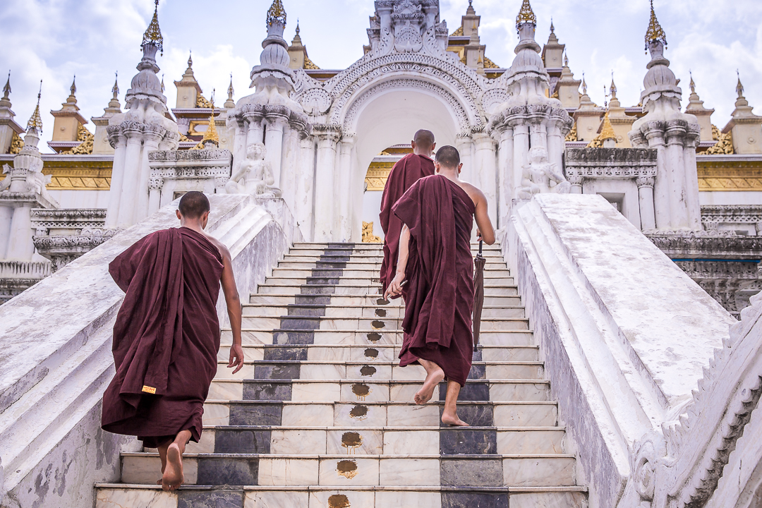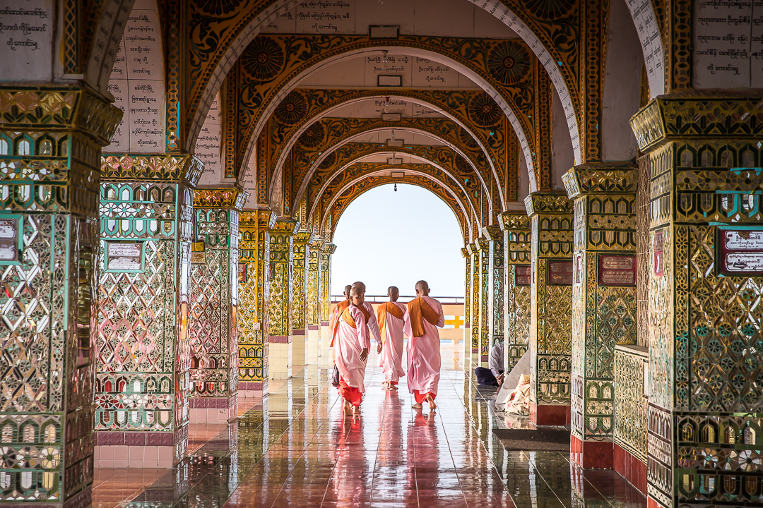 Mutta kylläpä etukäteisvaroittelut Mandalayn tylsyydestä ja mitäänsanomattomuudesta osoittautuivat vääriksi, kun kurvailimme temppeliltä toiselle! Oli rauhallisuuden tyyssijalta vaikuttavaa Royal Palacea, jonka zenmäisellä sisäpihalla punakaapuiset munkit istuskelivat siellä täällä. Oli uniikkia Shwenandawin luostaria, joka huokui perinteistä burmalaista rakennustaidetta tiikkiseiniin ja kattoon koverrettuine buddhalaiskuvioineen ja myytteineen. Oli Atumashin luostaria sekä Sandamunin ja Kuthodawin pagodoja, joiden marmorinvalkoisia seiniä ja lattioita vasten kultaiset kupolit ja buddhafiguurit välkehtivät niin kirkkaina ettei niitä pystynyt ilman aurinkolaseja ihastelemaan. Ja kuin jalokivenä kaiken päälle korkealla vuorella sijaitseva Su Taung Pyae Pagoda, joka kaikessa kullan kimalluksessaan ja pastellinsävyissään vaikutti aivan entisaikojen satulinnalta. Vielä kun auringonlaskun aikaan pagodan käytävillä liihoitteli aloittelevia pikkumunkkeja vaaleanpunaisissa kaavuissaan, heräsi paikka mielessäni eloon menneiltä vuosisadoilta.