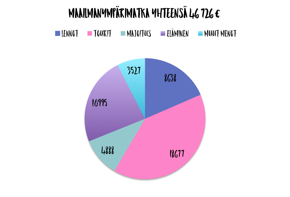 Vihdoin ja viimein sain käytyä läpi maailmanympärimatkan kulut ja muodostettua tuolle 10 kuukauden mittaiselle elämäni seikkailulle jonkinlaisen hintalapun. Ennen matkaa arvioin Budjetti maailmanympärimatkalle -postauksessa, että maailmanympärimatka tulisi kustantamaan kokonaisuudessaan noin 40 000 €. Lisäksi Maailmanympäri – lentolippupaketti hintoineen -postauksessa avasin hieman oman matkani lentolippujen hintoja.