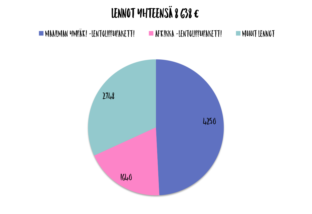 Ihan äärettömän hyvä, että olet avannut budjettisi meille, saa vähän osviittaa siitä mitä mihinkin kuluu. Nythän on ollut tosi edullisia tarjouksia mm. Lentodiilien kautta, että reissun pallon ympäri voisi saada lentojen osalta jopa 1000-2000 eurolla. Tämän postauksen avulla voi sitten laskea vähän suuntaa, että mitä kaikkeen muuhun menisi ja sitten vaan haaveilemaan lisää (ja nukkumaan, että jaksaa töihin). 🙂