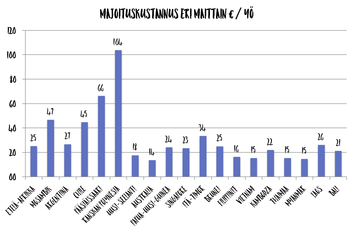 Selvästi kallein kohde majoituksen osalta oli Ranskan Polynesia ja toista sijaa listalla pitää Pääsiäissaari. Molemmista olisi toki löytynyt hostellivaihtoehtokin, mutta päädyin lopulta valitsemaan oman rantabungalowin Moorealla ja bed&breakfast-paikan Pääsiäissaarilta. Samoin Mozambikissa olisi ollut tarjolla todella edullisia hostelleja, mutta pienessä matkan alkujännityksessä päädyin valitsemaan bed&breakfast-majapaikan.
