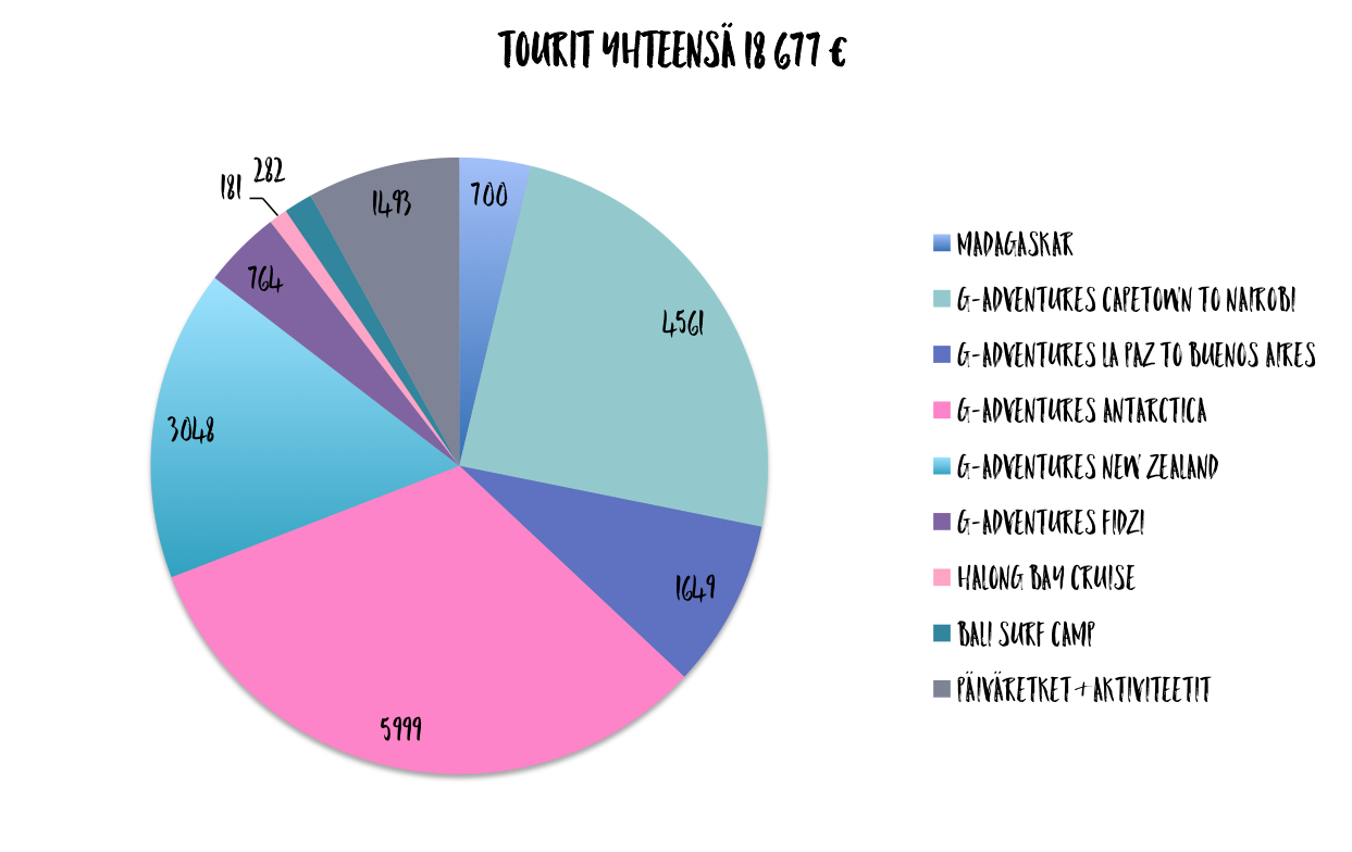 Kokonaishintalappu 10 kuukauden mittaiselle maailmanympärimatkalle oli 46 726 €. Suurimman kuluerän muodostivat odotetusti tourit, eli pääosin G-Adventuresin kautta tehdyt kiertomatkat, jotka kustansivat yhteensä 18 677 € kaikkine erikoisine aktiviteetteineen. Toiseksi eniten matkakassasta söi eläminen matkakohteissa, mikä kustansi kokonaisuudessaan 10 995 € kymmenen kuukauden ajalta, ja matkalla ollessa rahaa kului elämisen lisäksi majoitukseen 4 888 €:n verran. Yhteensä nämä muodostivat 15 883 € kuluerän. Lentolippujen hintalappu kaikkien matkalla tehtyjen lentojen osalta oli lopulta 8 638 €. Muihin sekalaisiin menoihin ennen matkaa ja matkalla ollessa kului 3 527 €. Näitä eri kustannuseriä ja tiettyjä oletuksia niiden osalta olen avannut tarkemmin postauksen seuraavissa kohdissa.