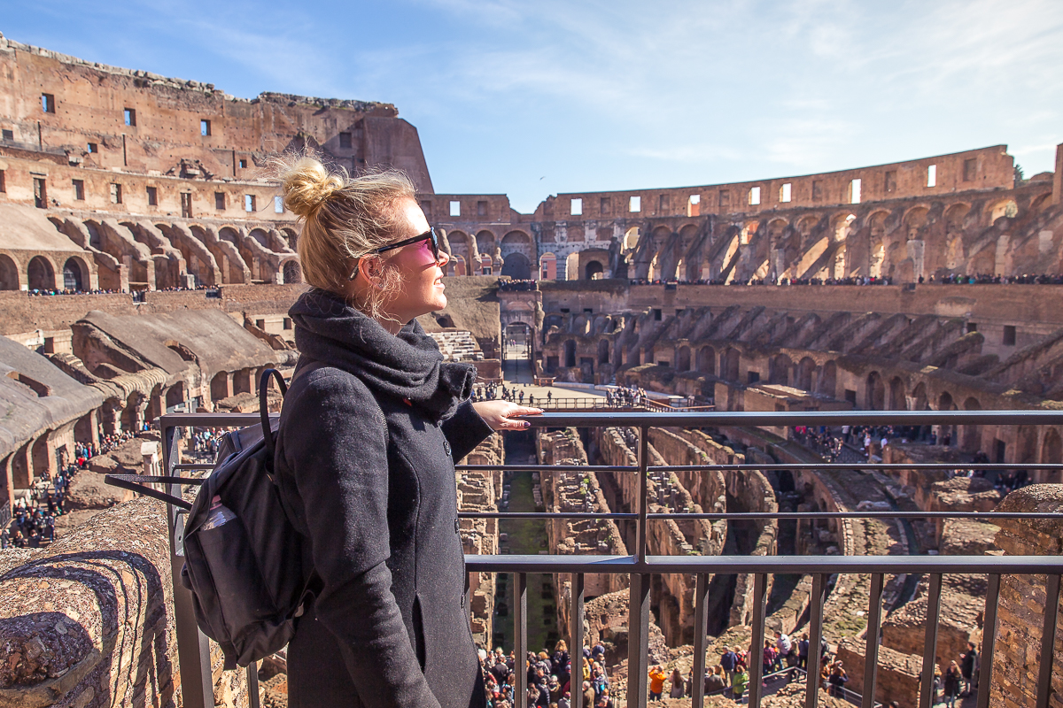 Rooman yksi upeimpia nähtävyyksiä on ehdottomasti Colosseum. Sen mahtipontisuus kuitenkin rapistuu nopeasti turistikaaoksessa lippuluukulta toiselle jonotellessa, joten etukäteen kannattaakin hankkia lippu, jolla pääsee pujahtamaan jonojen ohi sisään. Takaan, että on jokaisen ekstraeuron arvoinen. Liput voi hankkia netistä tai omasta majapaikasta esim. edellisenä iltana, lisäksi Colosseumin porteilla kiertelee kalliimpien ”skip the line” -lippujen myyjiä, joilta itse hankin Colosseum, Roman Forum & Palatine Hill -yhdistelmälippupaketin jononohituksineen 27 eurolla.