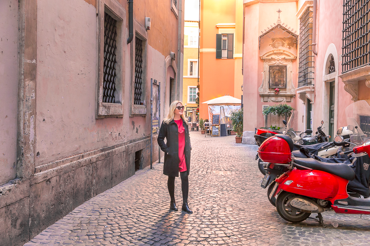 Rooman pienillä keskustakaduilla saisi helposti kulumaan päivän jos toisenkin piipahdellen italialaista muotia pursuilevissa putiikeissa ja poiketen toinen toistaan houkuttelevammissa kahviloissa ja ravintoloissa. Ja koskaan ei tiedä, mitkä näkymät ovat vastassa kun kurkkaa kadunkulmalta uuteen suuntaan, nimittäin näiden keskustakujien varrelta löytyy myös Rooman upeimpia nähtävyyksiä. Kävelyreitin voi aloittaa vaikkapa Vatikaanin aukiolta yli kaunista Ponte Vittorio Emmanuelle II -siltaa, ja jatkaa siitä matkaa Piazza Navonan kautta näkemään Pantheon, Trevin suihkulähde ja Espanjalaiset portaat. Etukäteiskuvitelmat ja turha romantiikka näistä nähtävyyksistä kannattaa kuitenkin heittää romukoppaan ja varautua siihen, että kanssasi nähtävyyksiä tuijottelee satoja muitakin turisteja.
