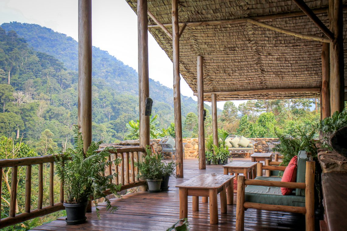 Tällainen miljöö oli odottamaton ekstra gorillavaellukselleni, sillä ennen matkaa olin ollut niin tohkeissani vaelluksen järjestelyistä, että majapaikan valinta meni aivan viimetippaan. Parissa paikassa sanottiin jo ei oota, ja hetken luulin yöpyväni alkeellisessa telttamajoituksessa. Mutta sitten kuin ihmeen kaupalla löysin itselleni sopivan hintaisen ja tyylikkäältä vaikuttaneen majapaikan. Engagi Lodge oli todellisuudessa oikeastaan vieläkin parempi, kuin ennen matkaa siitä saamani kuva. Lodgessa oli viehättävä päärakennus, jossa saattoi illallistaa tai muuten vain viettää aikaa takkatulen äärellä. Erityistä tilassa kuitenkin oli, että yhdeltä puolelta rakennuksesta puuttui seinä kokonaan ja tilalla oli iso terassi upeine maisemineen. Ja mihin seinää olisikaan tarvinnut, jos näkymät ovat tällaiset! Sain kuulla, että silloin tällöin gorillat vierailevat lodgen läheisyydessä, ja onpa joku uskalias nuori gorillaherra nähty kiipeilevän näillä terassin kaiteilla! Päärakennuksen lisäksi Engagi Lodgessa oli kymmenisen kappaletta erillisiä lodge-mökkejä, joissa yhdessä itse majoituin. Mökki ei ehkä vetänyt vertoja päärakennuksen upeudelle, mutta tarjoisi minulle sopivan tukikohdan hengähtää luontokokemusten välissä.