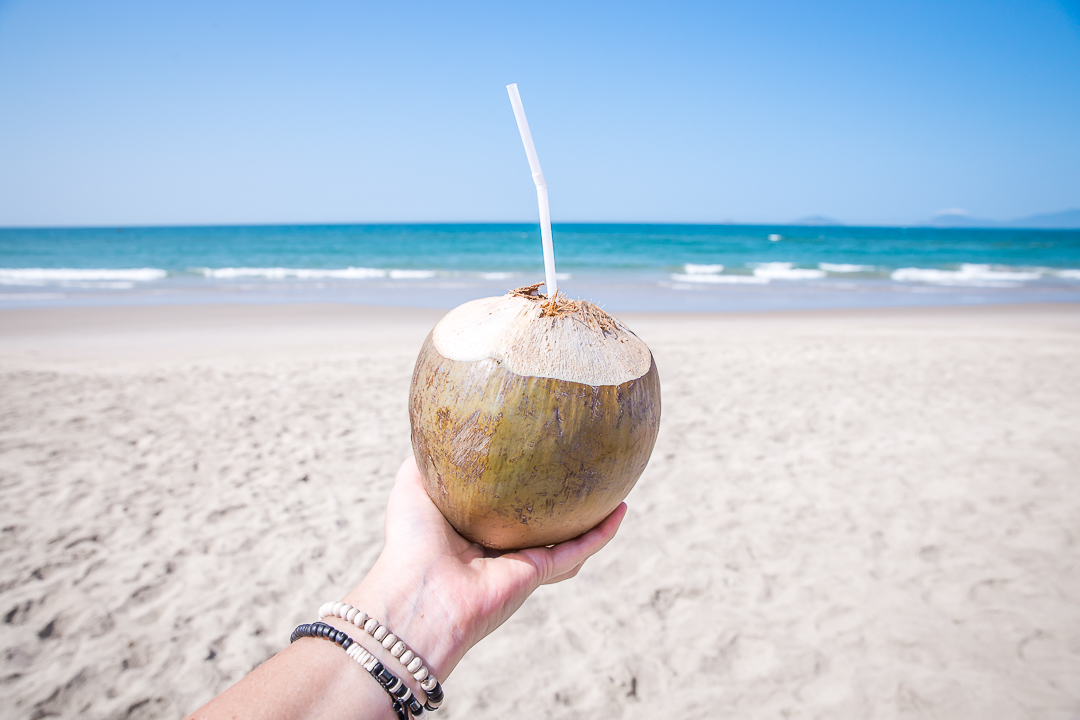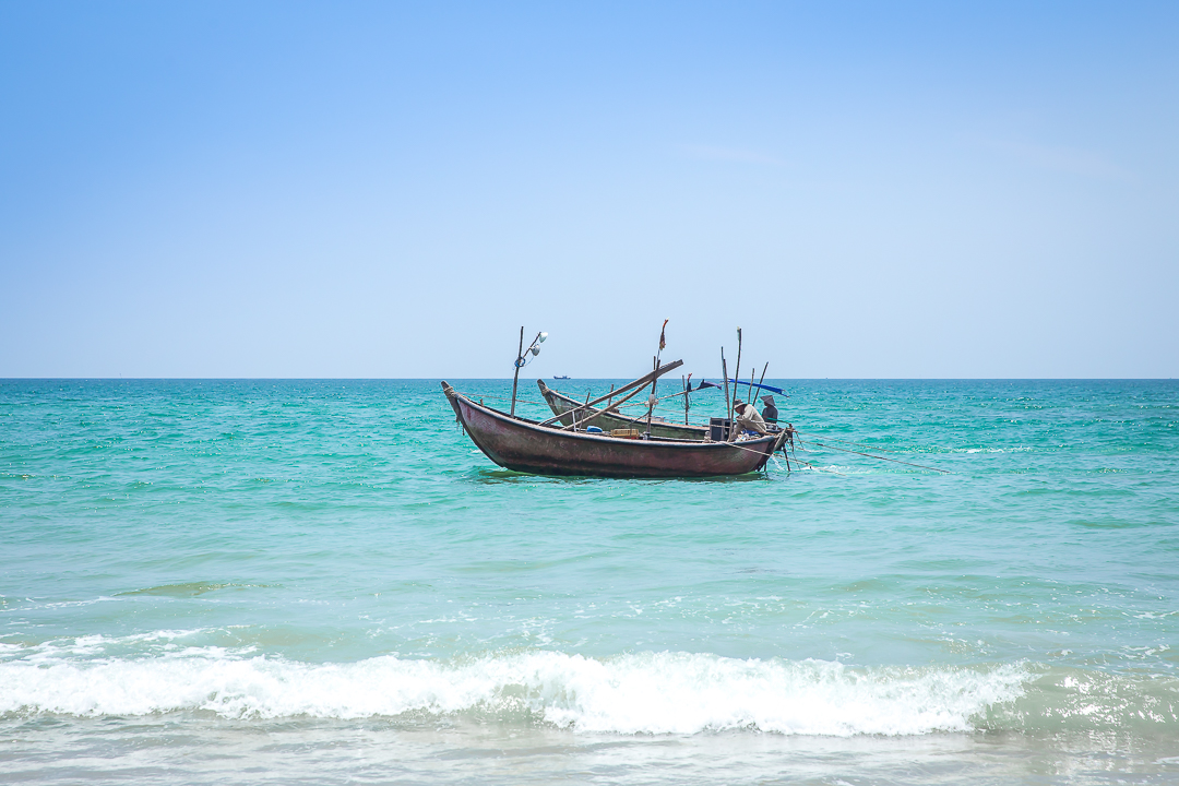 Mutta en valita, tuntuu nimittäin hurjan hyvältä olla takaisin rannalla! Ehdinhän tässä jo muutaman päivän kaupunkielämästä nauttia, heh. Jos jotain olen tämän reissun aikana huomannut, on se ehdottomasti se tosiasia, että viihdyn kaikista parhaiten rannalla, meren aaltojen äärellä. Varpaan välit täynnä hiekkaa, hiukset merten aalloista surffikiharoilla. Kädessä kookospähkinä ja edessä avarat merimaisemat. Ja kyllä näillä Hoi Anin rannoilla kelpaa! Rantaviivaa riittää vaikka muille jakaa, hiekka on ihanan pehmoista ja valkoista (tosin polttavan kuumaa keskipäivällä) ja turkoosi meri heittelee leikkisästi välillä pieniä ja välillä isoja aaltoja rantaan, ja niiden seassa kelluu paikallisten hassunnäköisiä puuveneitä – osa näyttää ihan jättikokoisilta kookospähkinän kuorilta! Parasta hupia polttavassa kuumuudessa on kuitenkin ollut paeta hellettä aurinkotuolista ja aurinkovarjon alta yhä uudelleen mereen: olen pompinut aalloilla kuin pieni lapsi ja harjoitellut sukeltamista niiden läpi (kuvitellen tietenkin, että surffilauta on mukana).